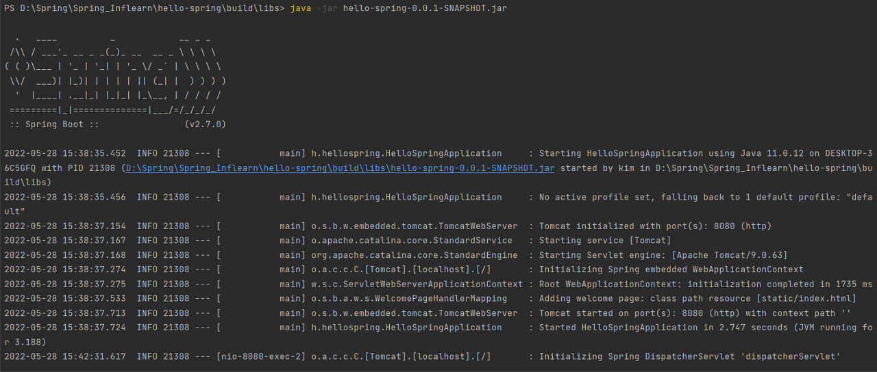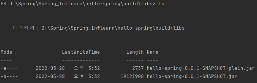 libs ํด๋ ๋ด์ hello-spring-0.0.1-SNAPSHOT.jar, hello-spring-0.0.1-SNAPSHOT-plain.jar๊ฐ ์กด์ฌ