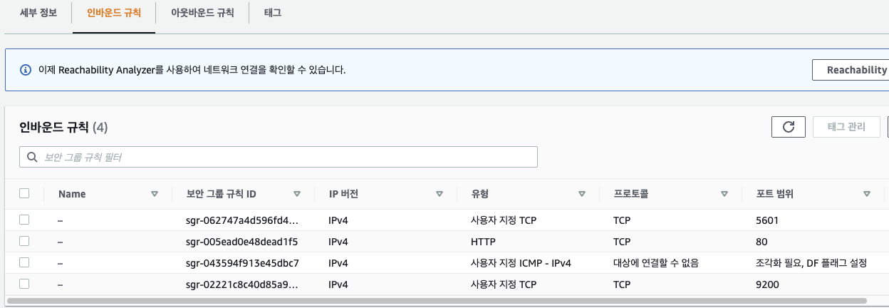 [EC2 -> ๋ก๋๋ฐธ๋ฐ์ -> Security์์ ํธ์ง(type, Protocol: TCP / Port: 9200 / Socure: ๋ณธ์ธ IP ๋๋ ๊ทธ๋ฃน]