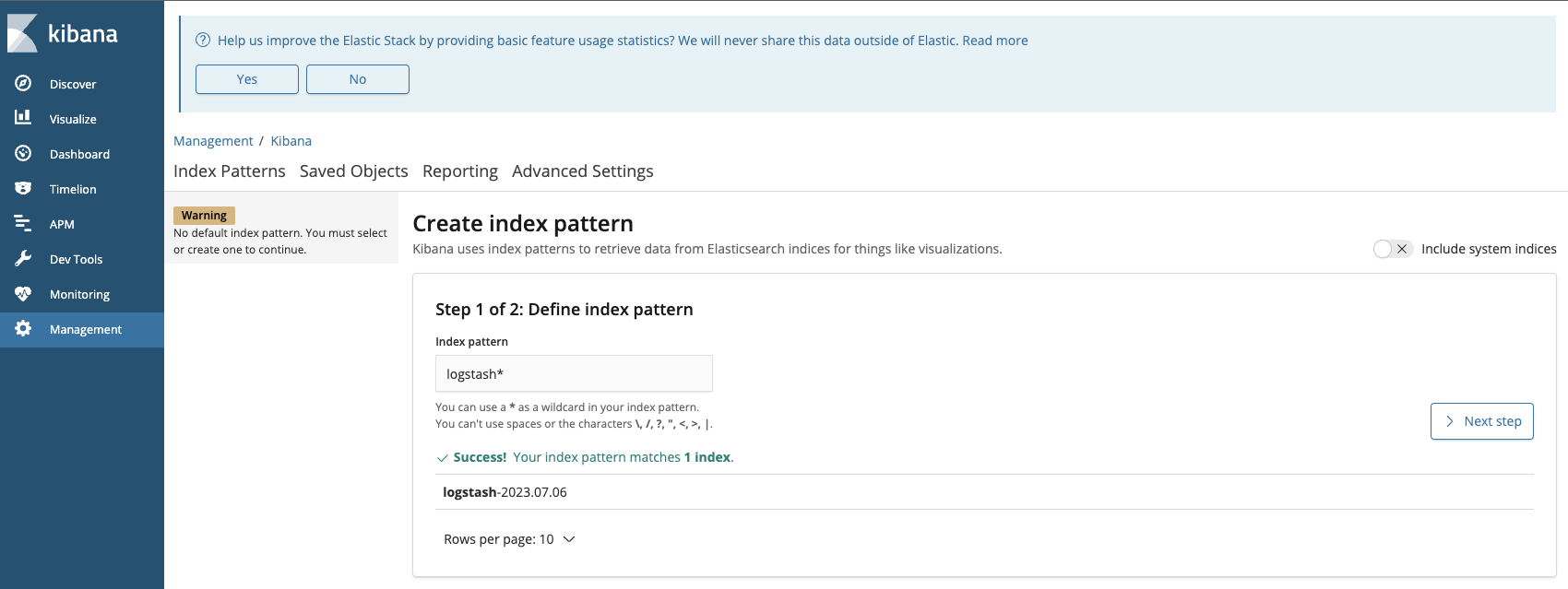 ์ด์ Kibana์ ์น์ ํตํด index pattern์ ์์ฑํด์ค๋ค.