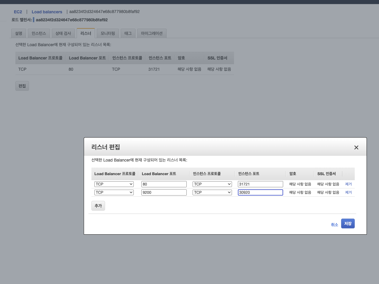 2. LoadBalancer์ Listener ํธ์ง -> 9200๋ฒ ํฌํธ๋ก ์ ๋ฌ๋ ํธ๋ํฝ์ instance(WorkerNode)์ 30920 ํฌํธ๋ก ์ ๋ฌ