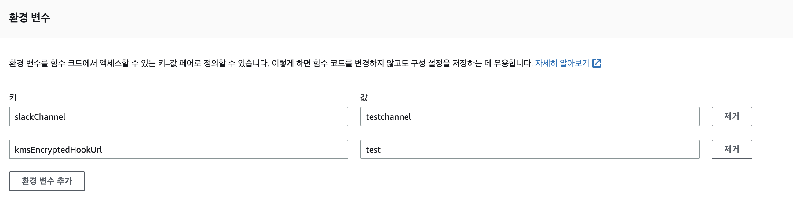 ํด์ค์ผ ํ๋ค. slackChannel๊ณผ kmsEncryptedHookUrl์ ์ถ๊ฐํด์ค์ผ ํ๋ค.