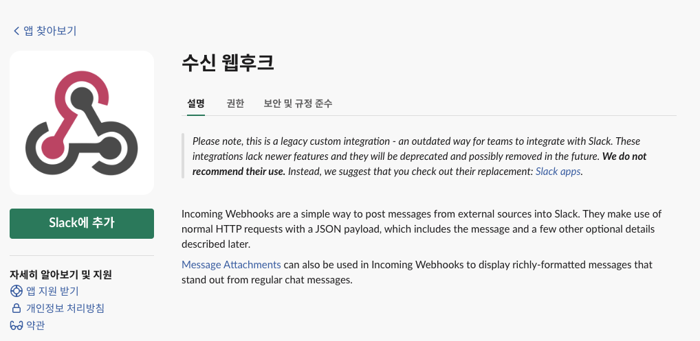 ์ฐ์ Slack์์ ์ ์ํฌ์คํ์ด์ค๋ฅผ ์์ฑํ๊ณ ์ค์ ์์ web hook์ ์ถ๊ฐํด์ค๋ค.