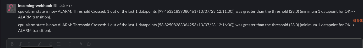 CloudWatch์์ ์๋ ๋ฐ์ -> SNS ํธ์ ์๋น์ค ํธ์ถ -> Lambda ํจ์ ํธ๋ฆฌ๊ฑฐ -> Slack ์ฑ๋๋ก ์๋์ ์ก
