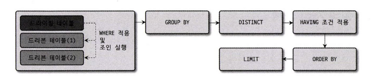 ๋๋ผ์ด๋น ํ ์ด๋ธ(WHERE ์ ์ฉ) -> ORDER BY -> ๋๋ฆฌ๋ธ ํ ์ด๋ธ(์กฐ์ธ ์ ์ฉ) -> LIMIT