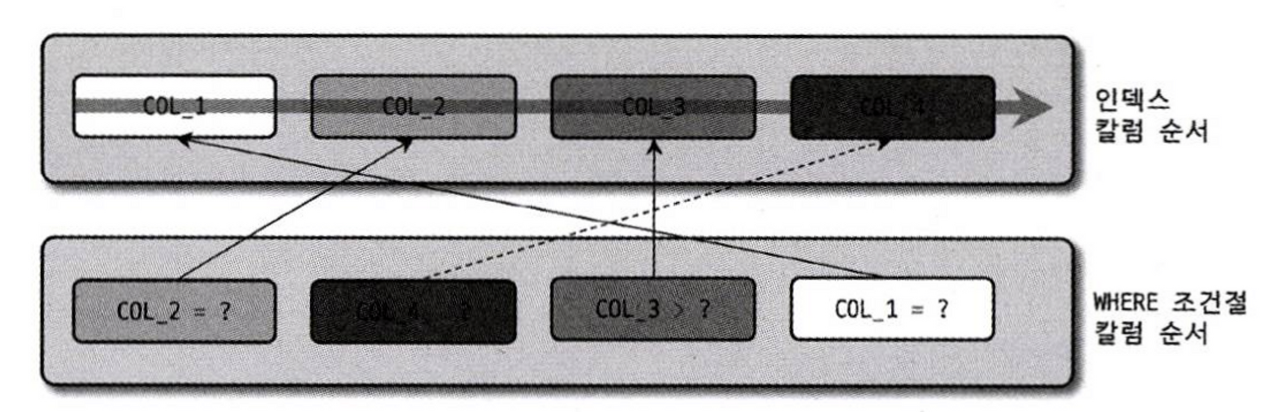 ์ด๋ WHERE ์กฐ๊ฑด์ ๊ณผ ์ธ๋ฑ์ค ์ปฌ๋ผ ์์๊ฐ ์ผ์นํ์ง ์์์๊ฐ ์๋๋ผ, ์ธ๋ฑ์ค ์์์ COL_4 ์ง์ ์ปฌ๋ผ์ธ COL_3๊ฐ ๋ฒ์ ๋น๊ต ์กฐ๊ฑด์ผ๋ก ์ฌ์ฉ๋๊ธฐ ๋๋ฌธ์ธ ๊ฒ์์ ์์์ผ ํ๋ค.