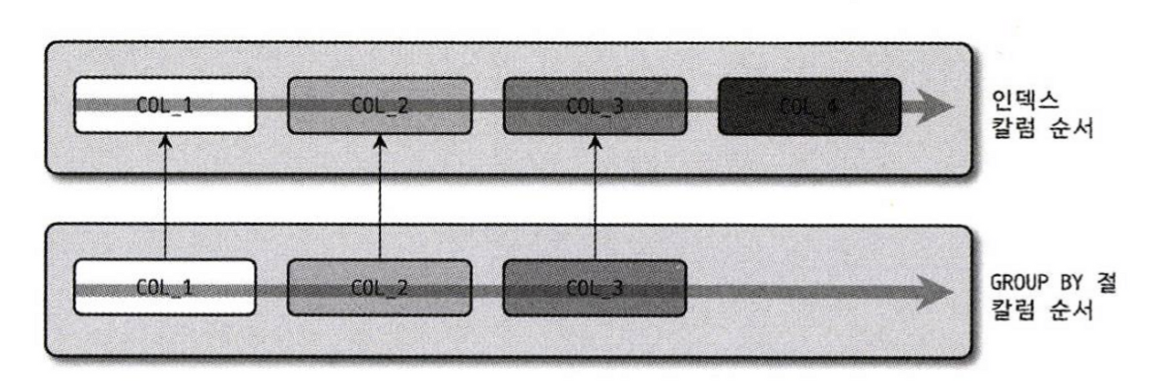 ์๋ ์ปฌ๋ผ์ ์์๊ฐ ์ธ๋ฑ์ค๋ฅผ ๊ตฌ์ฑํ๋ ์ปฌ๋ผ์ ์์์ ๊ฐ์ผ๋ฉด GROUP BY ์ ์ ์ผ๋จ ์ธ๋ฑ์ค๋ฅผ ์ด์ฉํ ์ ์๋ค.