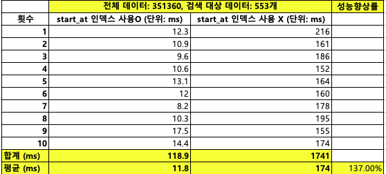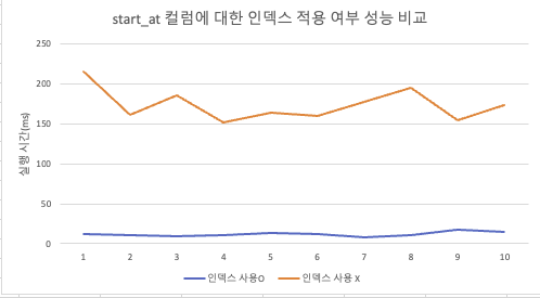10ํ ์ฟผ๋ฆฌ ์ฑ๋ฅ์ ์ธก์ ํ์์ ๋ start_at์ ๋ํด