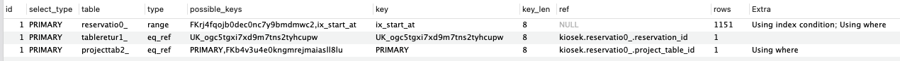 - rows: 1151๊ฐ๋ก WHERE์ ์์ ์ธ๋ฑ์ค๋ก ์ค์ ๋ start_at ์ปฌ๋ผ์ ๋น๊ต๊ฐ ๋จผ์ ์คํ๋์ด ๋น๊ต ํด์ผํ ๋ ์ฝ๋๊ฐ ํ ์ค์๋ค๊ณ ํ๋จ๋๋ค.