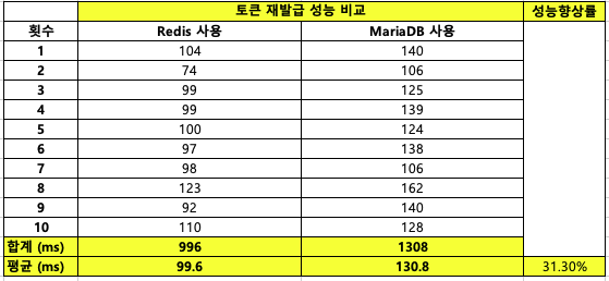 3. ํ ํฐ ์ฌ๋ฐ๊ธ ๊ธฐ๋ฅ์ Redis์ MariaDB ์ฑ๋ฅ ๋น๊ต