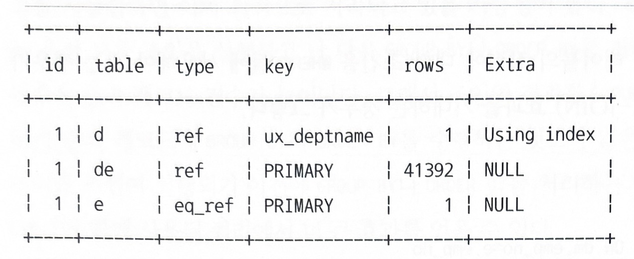 - "e.emp_no=10001"๊ณผ ๊ฐ์ด employees ํ ์ด๋ธ์ ์์ฃผ ํจ์จ์ ์ผ๋ก ๊ฒ์ํ ์ ์๋ ์กฐ๊ฑด์ด ์๋๋ผ๋ ์ตํฐ๋ง์ด์ ๋ Bํ ์ด๋ธ์ ๋๋ผ์ด๋น ํ ์ด๋ธ๋ก ์ ํํ ํ๋ฅ ์ด ๋๋ค.
