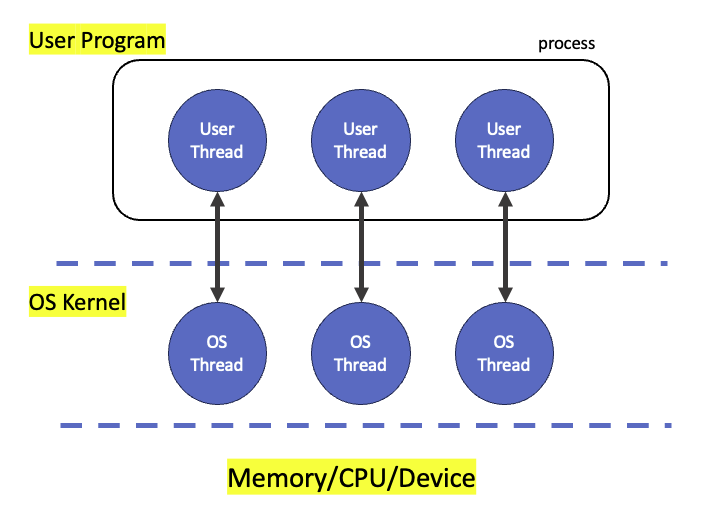 - User Thread(Process์ ์ค๋ ๋) ์์ฑ์ OS Thread(OS ๋ ๋ฒจ์ ์ค๋ ๋)์ ์ฐ๊ฒฐํ๋ค.