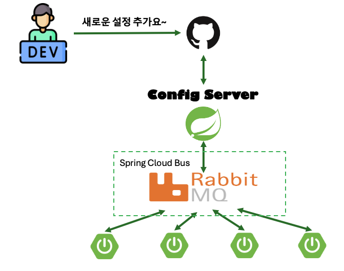 - Config Server๋ ์ด ์ ๋ณด๋ฅผ Spring Cloud Bus๋ฅผ ํตํด RabbitMQ๋ก ๋ณด๋ธ๋ค.