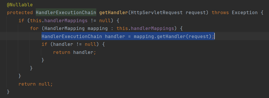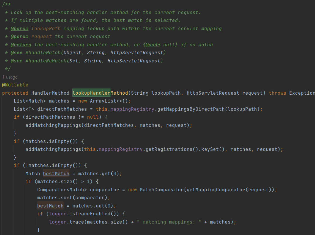 주석에서 볼 수 있듯이 현재 요청에 가장 잘 매칭되는 handler method를 찾는다고 하네요.