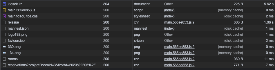 ๋ง์ง๋ง์นธ์ reservations?....๋ผ๋ ํธ์ถ์ด ๋ฐ์ํ๊ฒ์ ๋ณผ ์ ์๋๋ฐ ์ด์ Reuest URL์ ํ์ธํด๋ณด๋ฉด https://kiosek.kr/api/v1/reservations?... ์ ํธ์ถ์ด ๋ฐ์ํ์ฌ Response ๊ฐ์ WAS -> Web Server๋ฅผ ํตํด ๋ฐ์์ค๋ ๊ฒ์ ๋ณผ ์ ์๋ค.