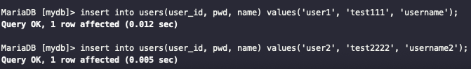 ์ด๋ธ์ insert ๋์๋ 2๊ฐ์ user row๊ฐ ๋ค์ด๊ฐ ์๋ ๊ฒ๋ ํ์ธํ ์ ์๋ค.