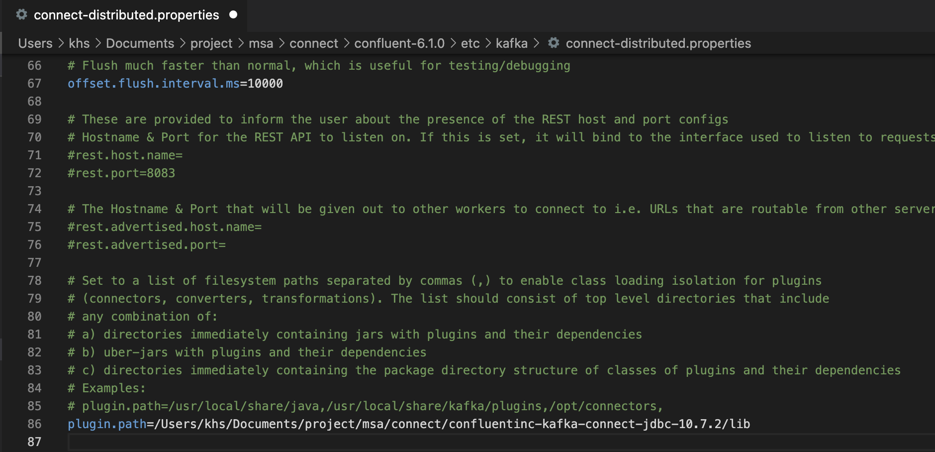 ๊ทธ๋ค์์ Kafka Connect ์ค์นํ ํด๋์ ๋ค์ด๊ฐ์ connect-distributed.properties ํ์ผ์ ์ด์ด์ ๋ฐฉ๊ธ ์ค์นํ Kafka Connect JDBC์ confluentic-kafka-connect-jdbc-10.7.2/lib ํด๋ ๋ด์ kafka-connect-jdbc-10.7.2.jar๋ฅผ ์ฌ์ฉํ๋๋ก ์ฐ๊ฒฐํด์ผ ํ๋ค.