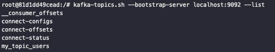 sink connector ๋ฑ๋ก ์์ auto.create=ture ์ค์ ์ ์คฌ์ผ๋ฏ๋ก ์์ ๊ฐ์ด my_topic_users ํ