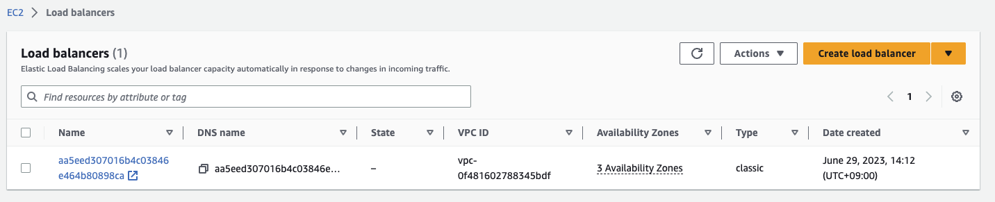 AWS ํ์ด์ง์์๋ Load Balancer๊ฐ ์์ฑ๋ ๊ฒ์ ๋ณผ ์ ์๋ค.