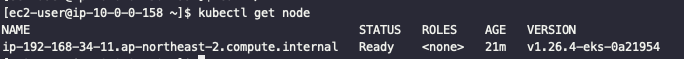 eksctl create cluster --name mission-cluster --version 1.26 --region ap-northeast-2 --nodegroup-name mission-wn --node-type t3.medium --nodes 1 --nodes-min 1 --nodes-max 1 --ssh-access --ssh-public-key workernode-key --managed