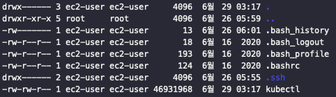ec2-user ๊ณ์ ์ผ๋ก ์ ์ํ์ ๋๋ ๋ฃจํธ ํด๋์ ์๋์ ๊ฐ์ด .ssh ์จ๊นํ์ผ์ด ์กด์ฌํ์ง๋ง ๋ค๋ฅธ ๊ณ์ ์ผ๋ก ์ ์ํ์ ๋๋ ๋ฐ๋ก ์ค์ ์ด ๋์ด ์์ง ์๊ธฐ ๋๋ฌธ์ ec2-user ๊ณ์ ์ผ๋ก ์ ์ํด์ผ ํ๋ค.