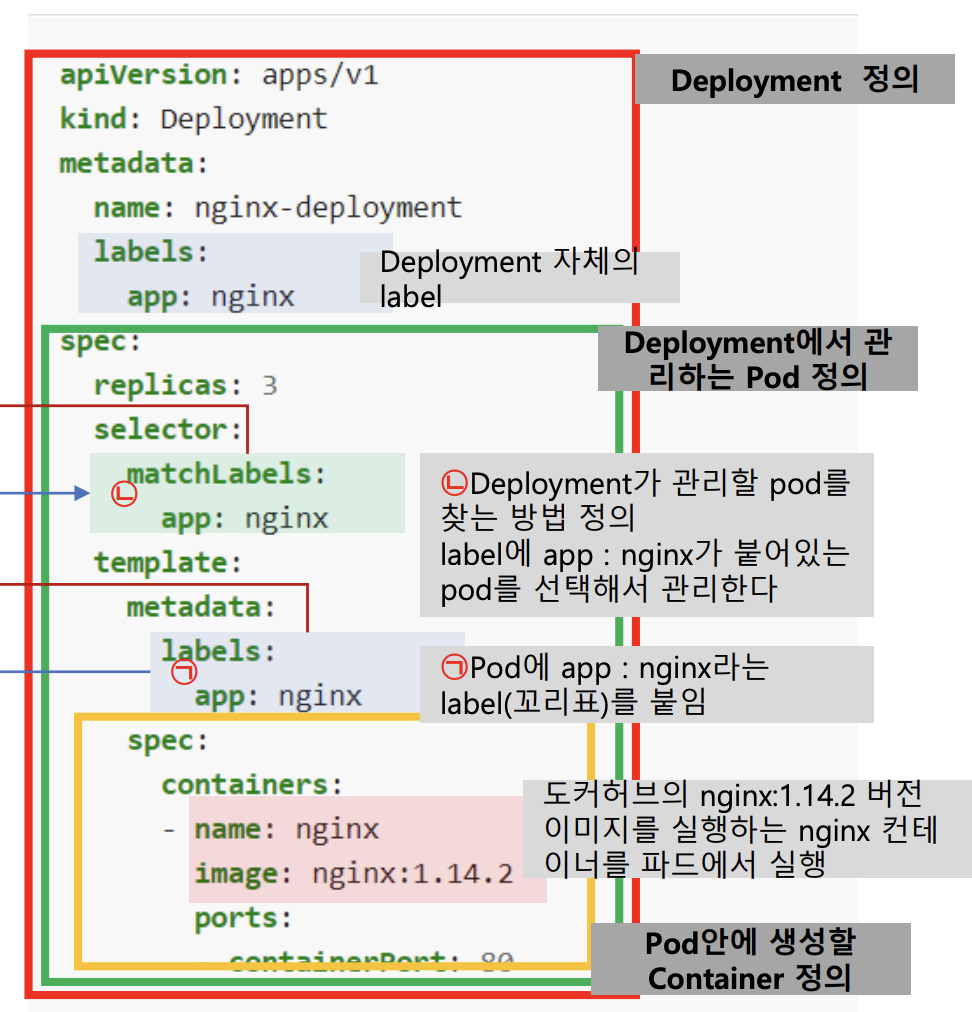 (1) nginx-deployment.yaml : Deployment ์์ฑ ( ๋ช ๊ฐ์ Pod๊ฐ ์ผ๋ง๋งํผ์ ์์์ ์ฌ์ฉํ๊ณ ์ด๋ค ๋ฐฉ์์ผ๋ก ๋ฐฐํฌํ ์ง ์ ์)